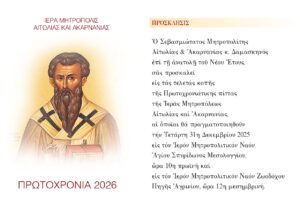 Την Πρωτοχρονιάτικη Βασιλόπιτα της Ιεράς Μητροπόλεως Αιτωλίας και Ακαρνανίας θα ευλογήσει ο Σεβασμιώτατος Ποιμενάρχης μας, Μητροπολίτης Αιτωλίας και Ακαρνανίας κ. Δαμασκηνός, την Τετάρτη 31 Δεκεμβρίου 2025.